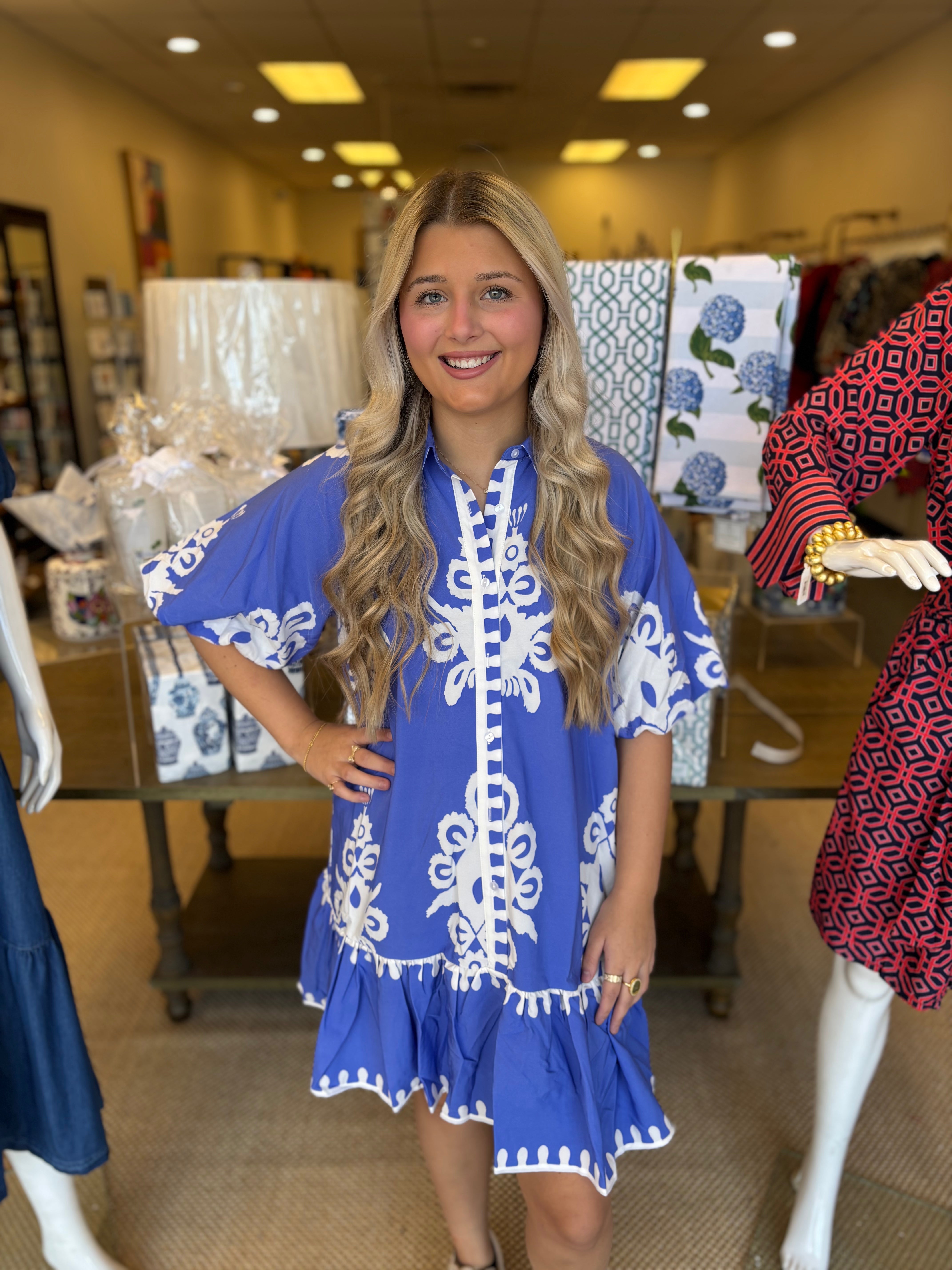 Blue Bold Print Mini Dress - S is backordered and will ship as soon as it is back in stock.