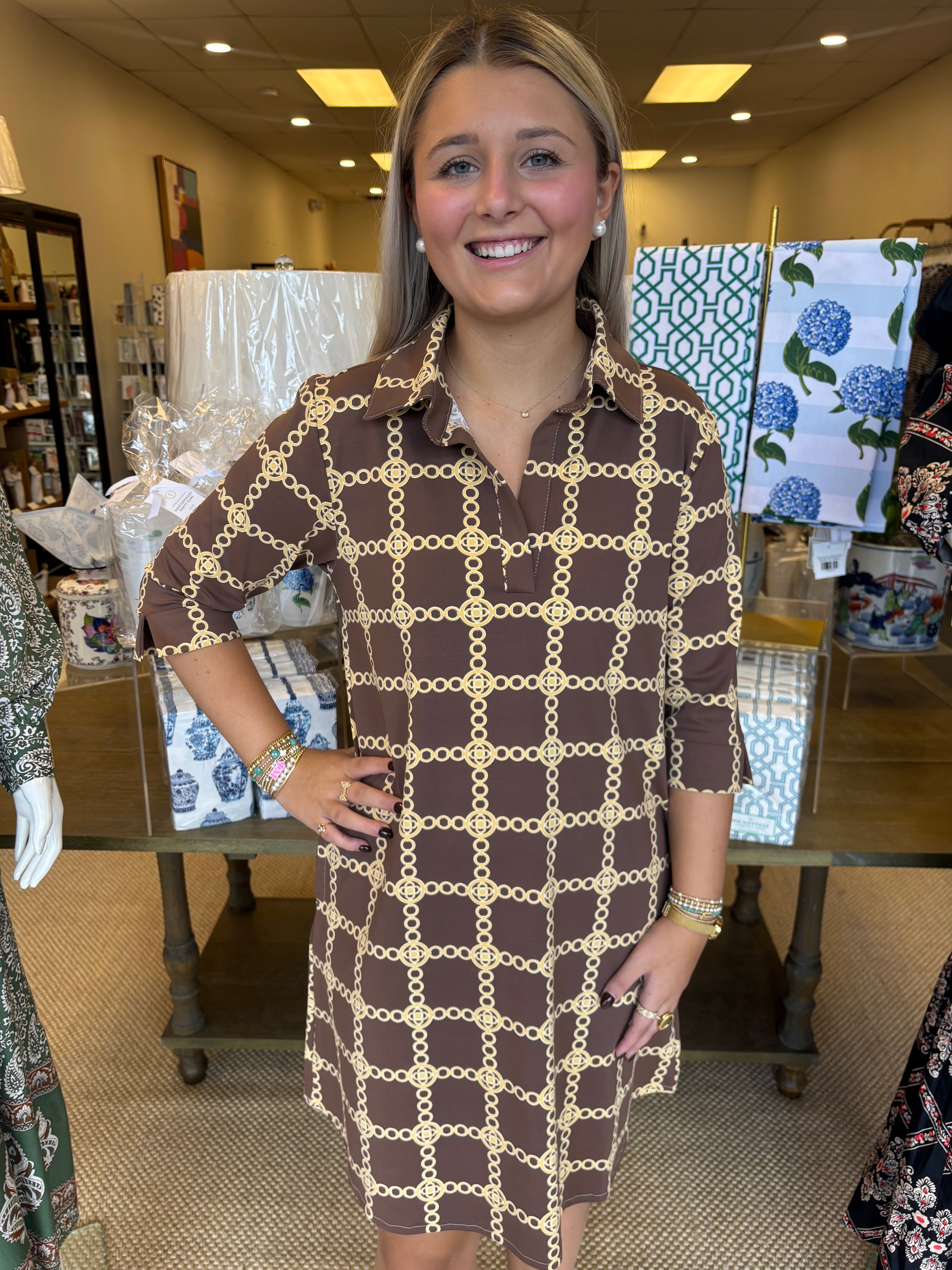 Autumnal colors accent the Lizzie dress in chocolate and tan. The popular design features 3/4 length sleeves and a collared neckline. sailor cloth is washable and wrinkle-resistant, made of 90% nylon, 10% spandex with moisture-wicking vaportex to keep you cool and dry. UPF 50+